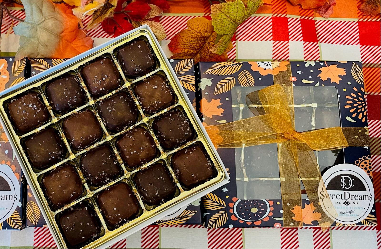16 sea salt caramels enrobed in milk, and dark chocolates, served in a holiday themed window gift box.